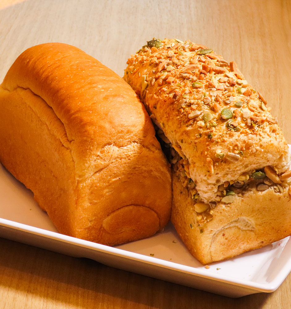 全粒粉は香ばしい小麦の風味を楽しめ、栄養価が高くヘルシーな食パン。周りにナッツを散りばめております。