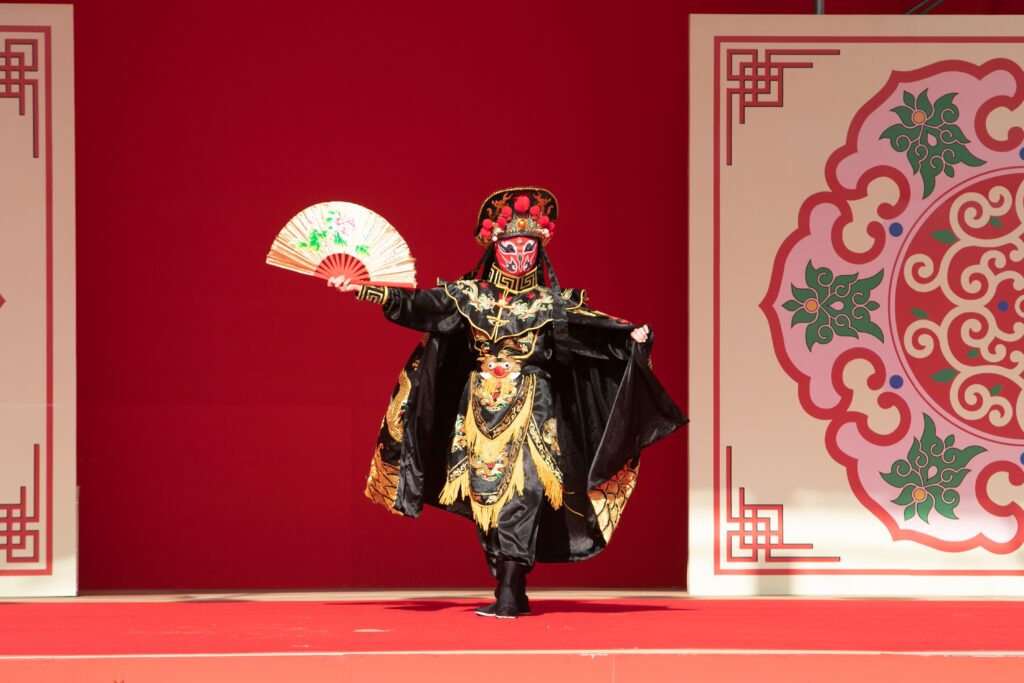 中国の伝統衣装に身を包んだ踊り手が、扇子でふわりと顔を隠した――